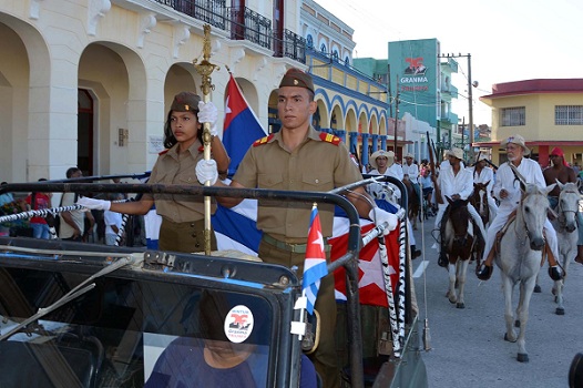 La abanderada de la tropa portaba la insignia que acompañó a Carlos Manuel de Céspedes en el alzamiento del 10 de octubre de 1868 en Demajagua, cuando liberó a sus esclavos e inició la primera guerra anticolonialista, antiesclavista y por la libertad en el país.