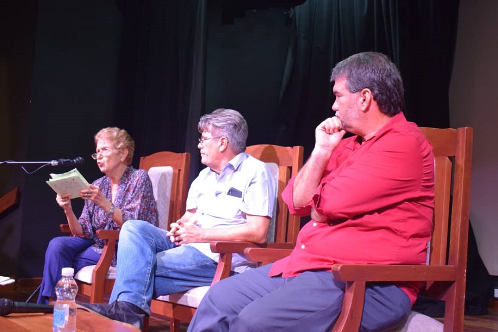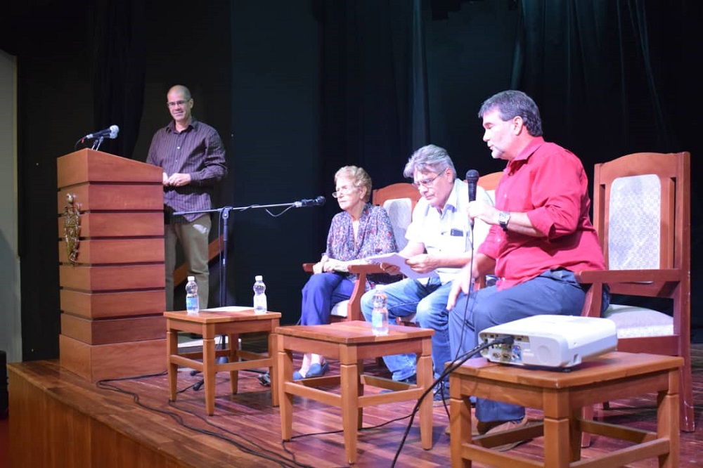 Acto seguido, se mencionaron los ponentes asistentes, entre los que se encontraban el narrador y ensayista Reynaldo González, Premio Nacional de Literatura, el investigador René González Barrios, director del Centro Fidel Castro Ruz, el novelista y ensayista Luis Toledo Sande, la profesora universitaria Leonor Amaro Cano y el reconocido investigador de temas históricos Carlos Venegas, entre otros. Cada uno subió al escenario del Teatro Hart y recibió el certificado de agradecimiento por su colaboración de manos del director de la institución.