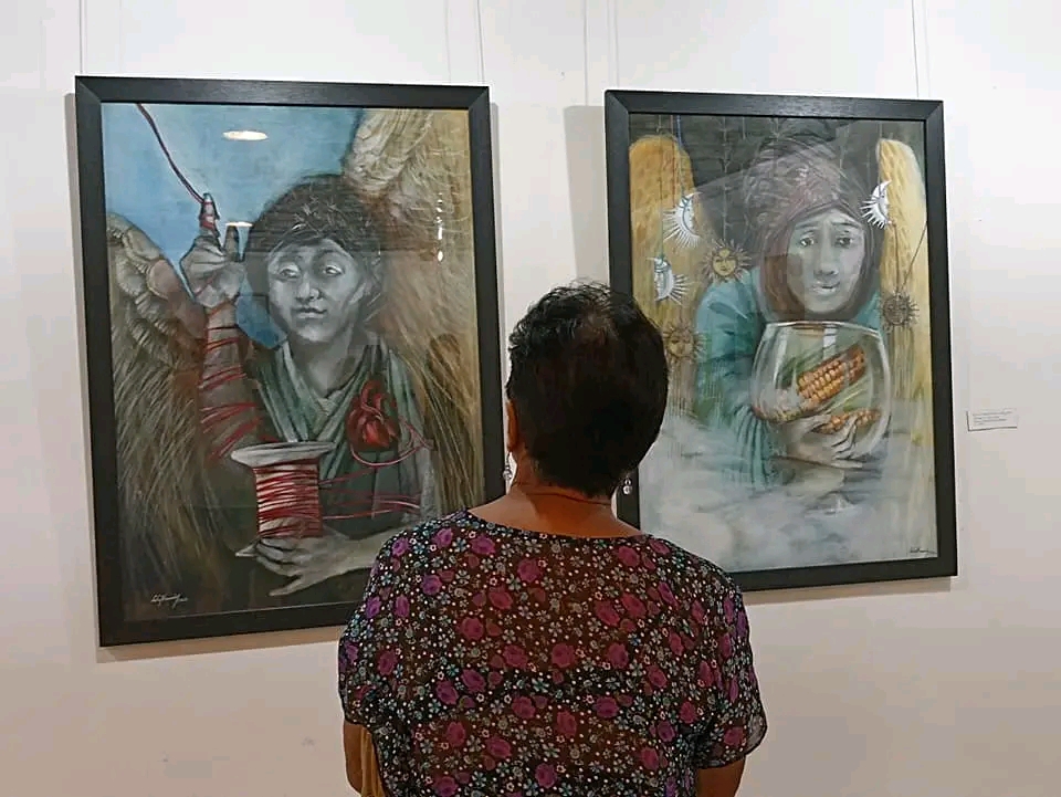 Ángeles y demonios andan juntos, con obras realizadas entre 2006 y 2009 —mi serie preferida en esta muestra, con curaduría de Berta Beltrán Ordoñez y dirección general de Yuricel Moreno Zaldívar— ostenta, respecto a su obra anterior, un cambio notable en el plano formal, al ganar espacio los tonos ocres, predominando la síntesis del dibujo. Los tonos en estas piezas se simplifican, las figuras se revelan en un rejuego expresionista, dúctil a contrastes y matices, en cercanía con la psiquis de la artista (estos ángeles y demonios dialogan en una especie de divertimento y sanación, de juego con una tradición occidental que se “transculturizó” en América Latina y que nos devuelven estos seres como si fueran sacados de una cosmovisión personal y popular al mismo tiempo, en picardía y paz).