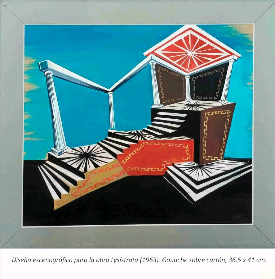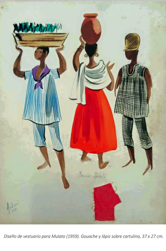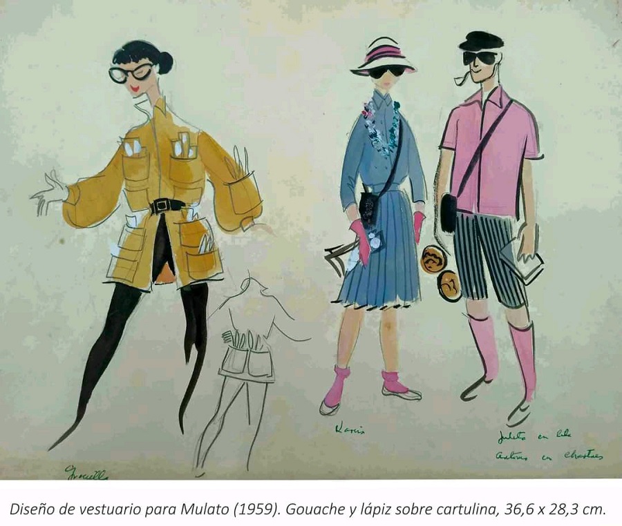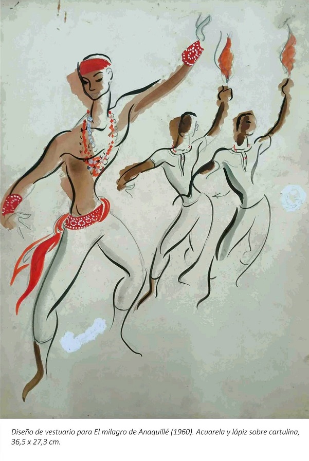 Ejemplo de lo anterior son las piezas —en gouache, acuarela y lápiz sobre cartulina o cartón— que componen la muestra, entre ellas dibujos del diseño de vestuario para las obras Adela (1958), Mulato (1959), El milagro de Anaquillé (1960) y Liborio y la esperanza (1962), y del diseño escenográfico de Cecilia Valdés (1961) y Lisístrata (1963), estrenadas por diferentes colectivos.