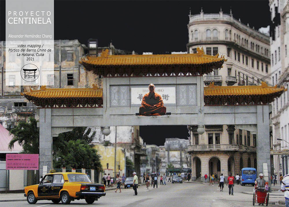 Como parte importante de su creación, Alexander Hernández Chang (1987) busca sus temas en la fuente materna de origen chino. Él ha venido asimilando los componentes asiáticos que fusiona con el acervo cubano para mostrarnos una visión mestiza de la idiosincrasia insular. Su propuesta de intervención pública, Centinela, elaborada para la próxima Bienal, descansa en un buda sentado colocado en la parte superior del portón que identifica al barrio chino habanero, proyectado en horas nocturnas con la técnica del video mapping. Como inusitado deseo, el creador bendice el espacio físico con la figura emblemática del religioso oriental para exponer la necesidad de buscar la tranquilidad espiritual luego de trascender la aversión y confusión del ámbito terrenal acosado por fuerzas siniestras marginales.