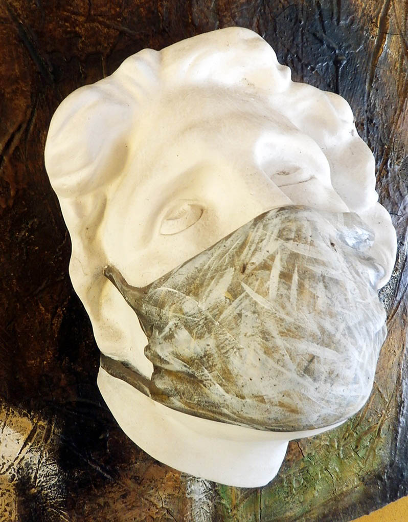 Hay una célebre escultura de Miguel Ángel (1475-1564) conocida como Esclavo moribundo, síntesis de la angustia de quien está próximo a la muerte, cuya cabeza fue tomada de modelo para hacer la alegoría del que sufre los embates de la actual pandemia. Con el título de Agonía, Félix Madrigal (1957) cubrió el rostro con una mascarilla del infestado para actualizar los momentos difíciles en que se encuentra. Por esa vía, se establece un parangón entre la obra de Miguel Ángel y la de Madrigal, con el propósito de mostrarnos cómo el arte puede borrar las barreras temporales al captar la esencia del moribundo en circunstancias disímiles, pero en igualdad de condiciones humanas. Este artista es conocido por sus esculturas de tamaño natural, que con óptica realista se encuentran emplazadas en el bulevar espirituano para perdurar su presencia en el imaginario popular.