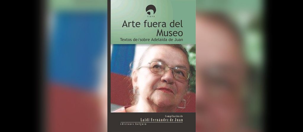 De referentes así, como la obra amplísima e imprescindible de Adelaida de Juan, uno va formando su escudo contra los molinos de viento, va añadiendo entradas a la “bibliografía” del cuerpo teórico y espiritual (más importante este último) que acompaña tu mirada. Por eso me satisface mucho que circule en nuestras librerías Arte fuera del Museo. Textos de/sobre Adelaida de Juan, publicado por Ediciones Holguín en 2019: un volumen que nos permite, desde un primer momento, notar que estamos siendo partícipes y cómplices de un homenaje, pues más que una recopilación de textos ensayísticos suyos y de otros autores que le rinden distinción, resulta un agradecimiento sincero a una de las principales voces críticas de nuestro país.