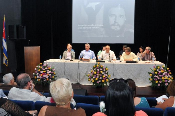 Por su parte, Díaz-Canel reflexionó acerca de la situación de Cuba en un contexto internacional donde los centros de poder insisten en imponer como cultura de vida la supremacía del neoliberalismo, la hegemonía del mercado y el fracaso de las ideas socialistas. A esas pretensiones, indicó, debemos responder con la eficiencia, el buen funcionamiento y la prestancia de las instituciones, favoreciendo la transparencia y la participación, promoviendo una cultura de comunicación con los creadores, socializando y haciendo más visibles los programas de desarrollo cultural, con un uso más eficiente de la informática, y con cuadros cuyas condiciones indispensables sean la sensibilidad y la inquietud revolucionaria.