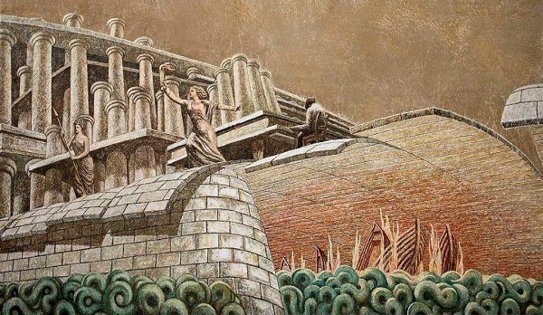 El origen iconográfico de los motivos explayados en Olympus lo encontramos, por supuesto, en la estética grecolatina, rescatada y reinterpretada durante el Renacimiento; pero, al retomar y recrear dichos motivos, Bejarano quiebra el consenso al introducir poses y relaciones semánticas extrañas, forzadas, sorprendentes, algo impensable para los renacentistas, pero en estrecho vínculo con los presupuestos del Manierismo. Cubano al fin, coquetea, incluso, con el humor, tal y como demuestran las oceánides tropicales, de carnes turgentes y bikinis breves, que se integran al bucólico esparcimiento recreado en “Bendición del esfuerzo”, la pieza más “profana” del conjunto. Bejarano al fin, reconoce de dónde viene y retoma ese personaje que, rematado por un sombrero, avanza, escala hacia el pecho de una posible Niké, o hace equilibrios al borde de una atalaya mientras, a sus espaldas, se desarrolla una peculiar escena, posible relectura del rescate de Andrómeda por Perseo.