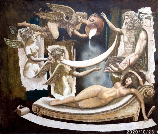 Contemplo la nueva serie y un nombre, un concepto, viene a mi mente: Manierismo. Bejarano ha echado garras a los principales presupuestos estéticos de los pintores y escultores que, en el Cinquecento, reaccionaron al idealismo renacentista violentando imágenes, forzando perspectivas, exagerando posturas y escorzos, comprimiendo ángulos, construyendo ilusiones peculiarmente elegantes. Tomemos, por ejemplo, la mano que Zeus extiende en “La savia secreta de la vida”. Esos dedos están prácticamente de nuestro lado del lienzo, nos involucran, nos hacen partícipes de la composición; detalle que me remite, sin evitarlo, al pie izquierdo de la Madonna del cuello largo, ubicado más en la realidad concreto-sensible que en la realidad pictórica concebida por El Parmigianino. Mitemas y mitos griegos perviven en Olympus, claro está, pero han sido representados desde la fractura del decorum: consenso clasicista que determina cuáles estilos o figuras son o no apropiados para los temas a tratar. Las representaciones clásicas de lo divino han necesitado, a lo largo de la Historia, de modelos iconográficos comedidos, correctos, que insistiesen en el poder incuestionable de lo numinoso y su irreductibilidad. Con su nueva serie, Bejarano subvierte este principio ético inherente a la retórica clásica.