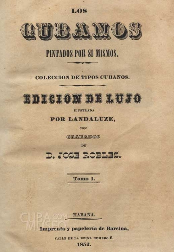 La cubierta del título que comentamos reproduce una pieza de 1852 —hace la friolera de 171 años—, de ese retratista de nuestros tipos, costumbres, modas y comportamiento decimonónico que fue Víctor Patricio Landaluze, al que Francisco Calcagno —citado por Zaida—, describe como un “notable caricaturista peninsular, y regular pintor de escenas de costumbres; (que) en 1862 fundó el periódico Don Junípero, satírico y de caricaturas”.[1] Pieza que lleva por título el mismo del libro que se comenta, Los cubanos pintados por sí mismos, donde pese a su ambicioso nombre, discrimina de manera arbitraria a un componente esencial de la nacionalidad en formación: “En Los cubanos… los negros apenas asoman (…) un libro que, queriendo pintar Cuba y a sus habitantes, obvió el gran tema de aquel siglo: la esclavitud”.[2]