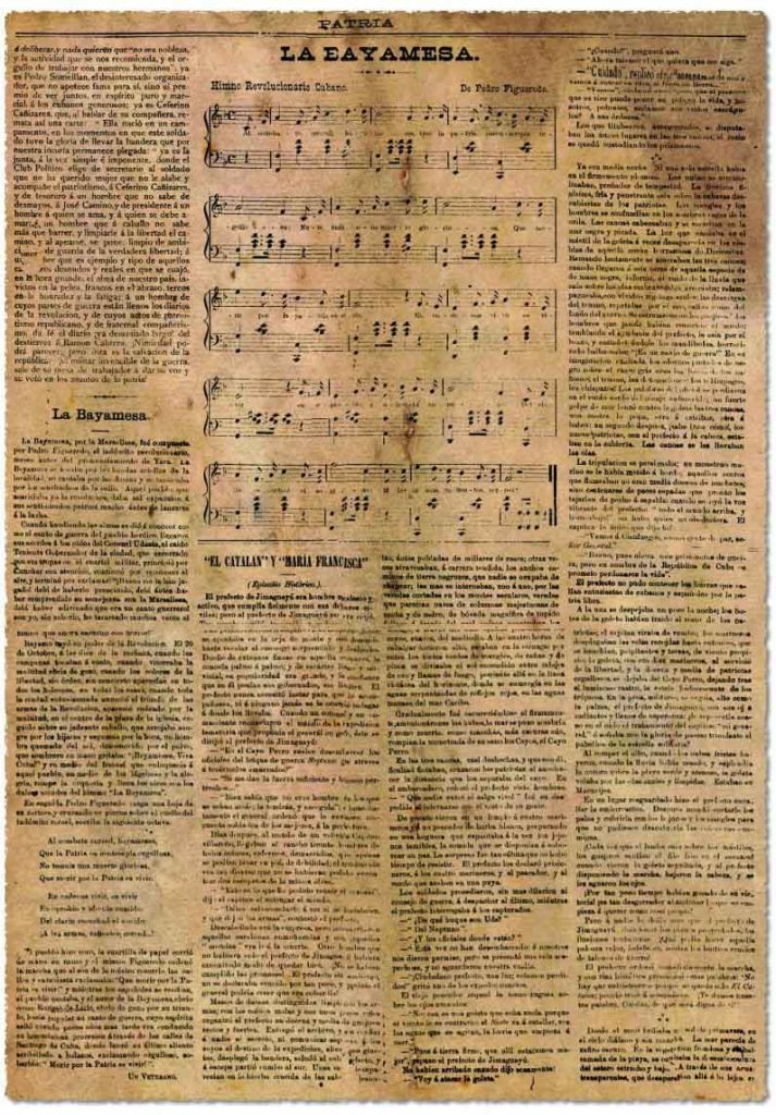 Pero antes, en el Bayamo liberado, habiendo asumido ya Céspedes el grado de General en Jefe del Ejército Libertador, y estando creado también su órgano difusor: “El Cubano Libre. Primer periódico independiente que se publica en Cuba”, en su número 4, del 27 de octubre de 1868, “Sección poética”, fue publicada la letra de “La bayamesa. Himno patriótico”, de Pedro Figueredo. Esta letra consistía exactamente en las dos estrofas con que lo cantamos hoy como himno nacional.