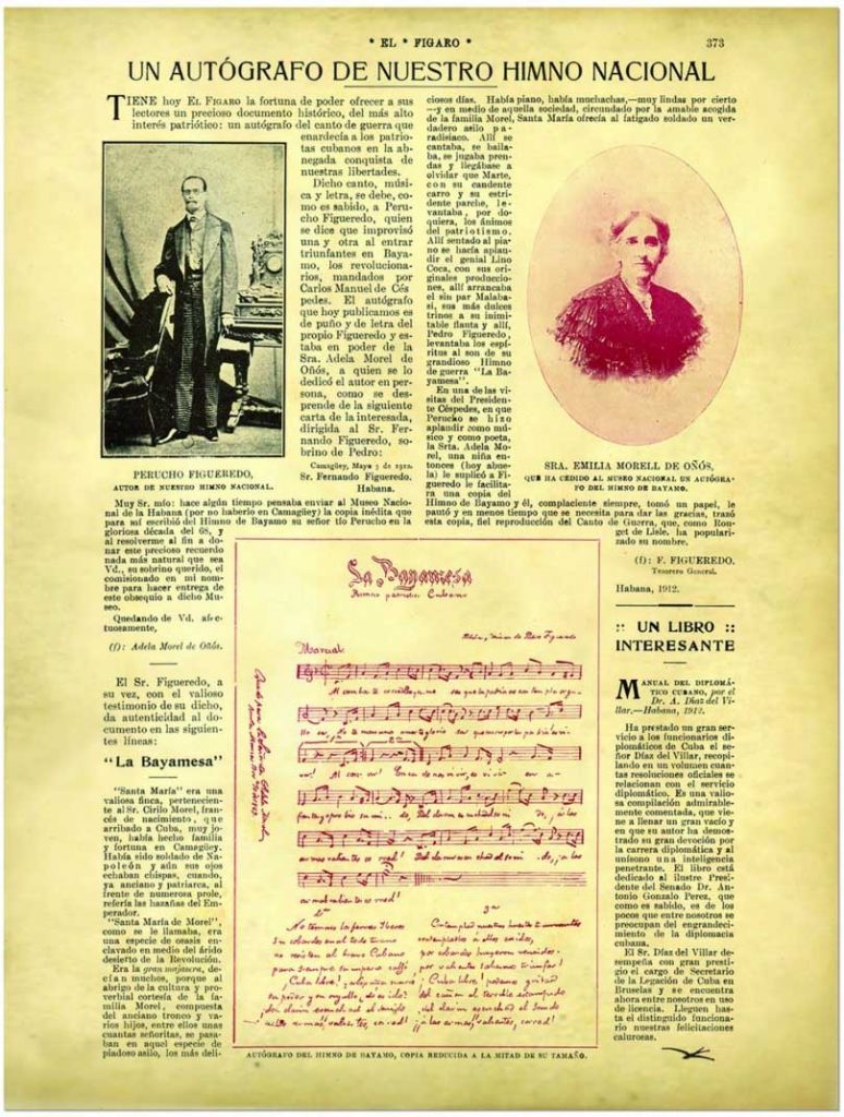 El 3 de mayo de 1912 el periódico El Fígaro publicó en La Habana una carta firmada por Adela Morel de Oñós dirigida a Fernando Figueredo, mediante la cual le encargaba entregar al Museo Nacional, que se gestaba entonces, “la copia inédita que para mí escribió del Himno de Bayamo su señor tío Perucho en la gloriosa década del 68”.