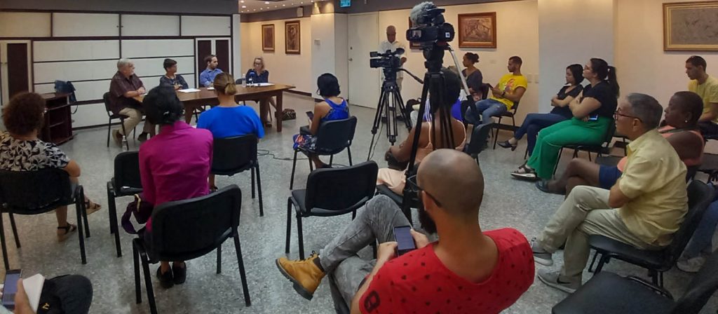 Luciano Castillo y Sara Vega, director y especialista de Gráfica de la Cinemateca de Cuba, respectivamente, junto a Anne Lamaistre, directora de la Oficina Regional de Cultura para América Latina y el Caribe de la Unesco, brindaron detalles del proceso de confección del expediente presentado a la organización, la importancia de estas obras como testimonio de una época y la utilización de diversos códigos, estilos y técnicas en los carteles.