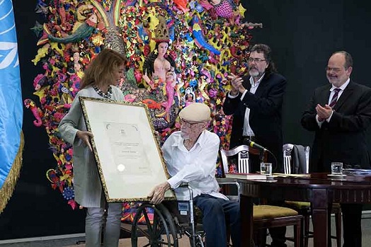 Roberto Fernández Retamar, presidente de Casa de las Américas, al recibir el premio de manos de Nuria Sanz, directora y representante de la Oficina de la Unesco en México, resaltó lo que representa la concesión de la distinción por la Unesco, a la que consideró un “verdadero oasis de cultura, tolerancia y paz en el mundo en que vivimos”.
