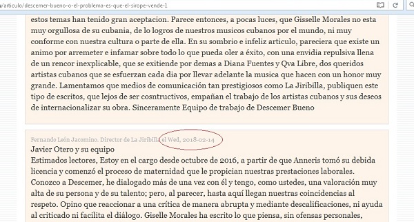 Hace poco más de una semana, publicamos en La Jiribilla el artículo Descemer Bueno: el problema es que el sirope se vende, de la joven periodista cubana Gisselle Morales Rodríguez. Entre los comentarios recibidos, nos llegó una carta de Javier Otero, manager de Descemer en Miami, donde se le pedía a Anneris Ivette Leiva, quien cesó en sus funciones de directora en octubre de 2016, explicaciones por la publicación del mencionado artículo. En breve ofrecimos respuesta a la misiva de Otero y la ubicamos como un comentario más. Sin embargo, en la tarde del pasado miércoles 21 de febrero, CiberCuba dedicó dos artículos al tema, uno para glosar el texto de Gisselle y otro para dar a conocer la molestia de Otero ante el mismo, censurando de paso nuestra respuesta al atribulado lector, accesible en nuestra web desde el pasado 14 de febrero. En aras de enmendar este acto de censura practicado por CiberCuba, compartimos con nuestros lectores la carta en cuestión: