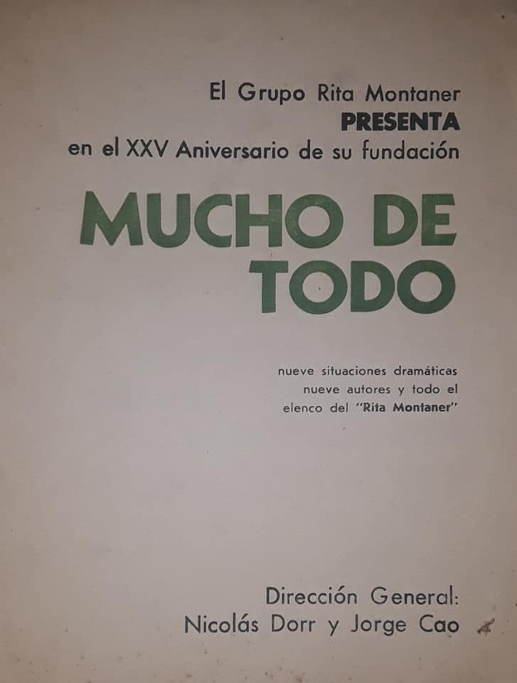Obra: Mucho de todo, de Abelardo Estorino, Nicolás Dorr, Eugenio Hernández, José Milián, José R. Brene, Mayté Vera, Ignacio Gutiérrez, Gerardo Fulleda y Abraham Rodríguez / Dirección artística: Nicolás Dorr y Jorge Cao / Escenografía: Guillermo Mediavilla / Música: Edesio Alejandro / Año: 1987 / Sala: El Sótano / Elenco: Jorge Cao, Margot de Armas y otros.