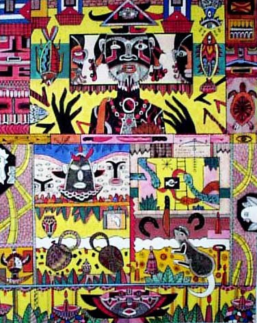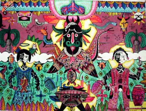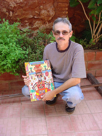Bajo la sombra de sus orishas tutelares, rodeado de libros, folletos, catálogos y varias obras concluidas y listas para ser expuestas, encontré en su hogar al pintor trinitario. Inclinado en la mesa de trabajo aún daba los toques finales a una de sus últimas cartulinas. En un rincón, vigilantes, se encontraban pequeñas esculturas, símbolos de los guerreros que lo acompañan y protegen. Varios collares —potenciales resguardos— permanecen colgados en la pared. En ese ambiente esotérico y saturado del misterio de la creación establecí el diálogo con el artista.