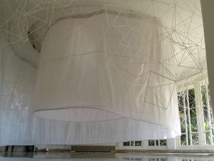 Es una retícula de tubos plásticos que marcan el vacío que hay dentro de la espiral; es como una malla que conecta puntos, supuestamente invisibles, que, como espectador, tienes que ser capaz de conectar. Generalmente, lo que sucede es que cuando accedes al centro de la espiral aprecias como una constelación y el público entra en un estado de contemplación —se acuesta en el piso, se sienta, se queda un rato pensando—. A ello se suma una serie de imágenes que se proyecta en toda la espiral y se superpone. La pieza cuenta, además, con tres proyectores.