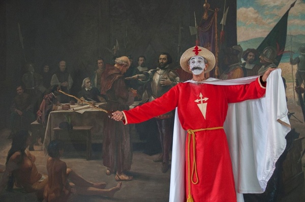 ¿Cuántas ciudades de Iberoamérica comparten el mismo nombre en honor a Santiago Apóstol? La musical y calurosa Santiago de Cuba, es una de ellas. Es menester hurgar en los antecedentes para entender cuál es el Santiago Apóstol que incorpora Dagoberto Gaínza, el mismo que hace flamear por la calles cada julio de carnaval. En 1976, el actor sustituye a Héctor Echemendía en la pieza teatral De cómo Santiago Apóstol puso los pies en la tierra, de Raúl Pomares. De una vez y para siempre. El autor toma inspiración en la estatua ecuestre que se conserva en el Museo Emilio Bacardí.