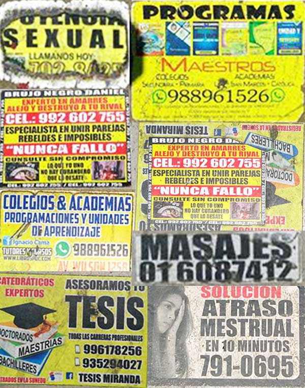 Anuncios alternativos adheridos a las aceras de Lima, Perú. Foto y composición digital: La Jiribilla