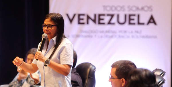En sus intervenciones durante el evento, Rodríguez afirmó que Venezuela se halla en medio de una guerra no convencional, como la que han experimentado otros pueblos del mundo no alineado. Los caminos de intervención que se han ido construyendo, explicó, han sido los de atacar el orden democrático y construir la idea de una crisis humanitaria