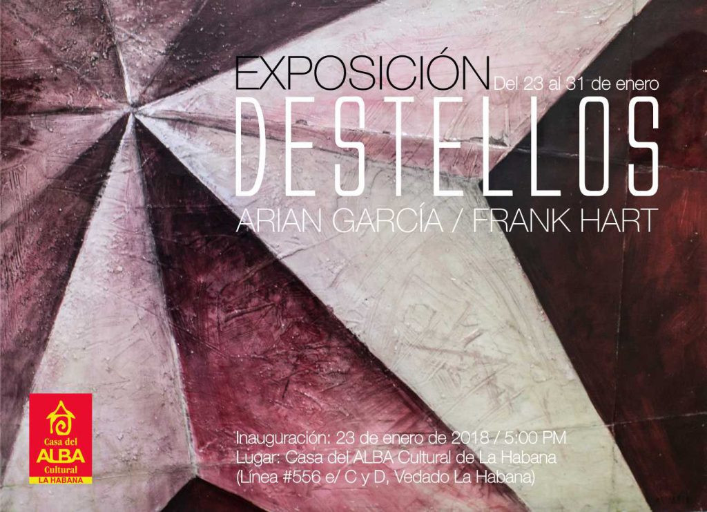 Otro homenaje digno de mencionar es la muestra Destellos, que se expondrá en la Casa del Alba Cultural desde el 23 y hasta el 31 de enero, realizada por Arian García García y Frank Hart, pertenecientes ambos a la más reciente generación de artistas de la plástica formados en nuestras academias.