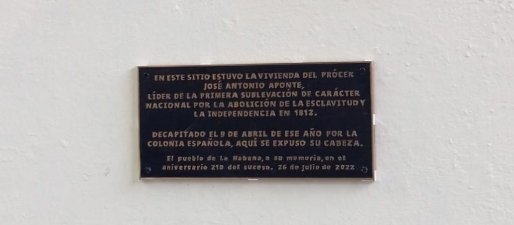 Una tarja dedicada a la memoria de José Antonio Aponte fue develada este miércoles a escasos metros del lugar donde el líder independentista y antiesclavista negro vivió y conspiró en 1812, y donde las autoridades coloniales exhibieron su cabeza en una jaula para escarmentar a quienes osaran combatir al régimen colonial y abogar por la abolición.