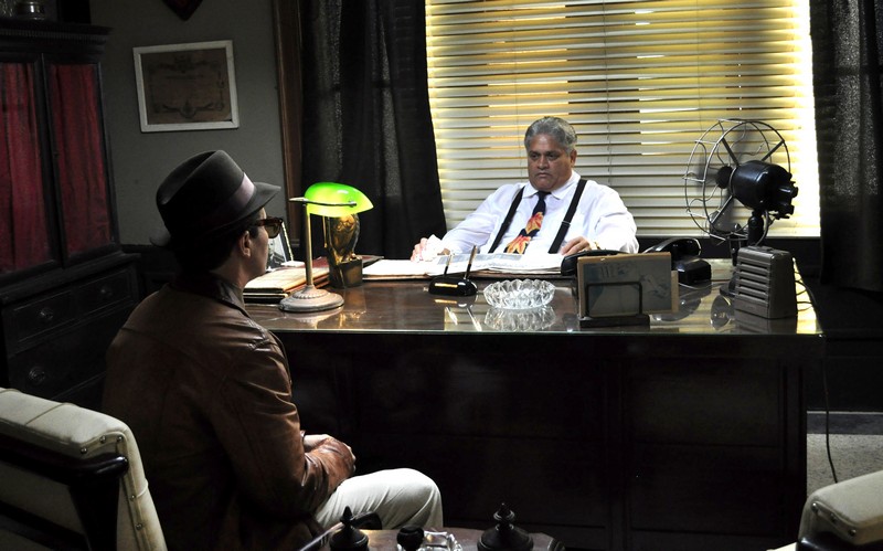 La presentación del detective también cumple con algunas reglas del noir. Primero, aparece su mano atendiendo la llamada del jefe, en una habitación en penumbras, exactamente en una cama, (tal vez demasiado lujosas, tanto la habitación como la cama). El hombre se levanta a regañadientes y se despierta también su nocturnal compañera de erotismo, una prostituta rubia, cabaretera para más señas, que le reclama se quede y le agradece el pago. Mientras se despliega la voz en off del detective que adelanta la trama (recurso ligado a casi todos los clásicos del cine negro) el hombre se va vistiendo con zapatos de dos tonos, sombrero de fieltro y chaqueta de cuero.