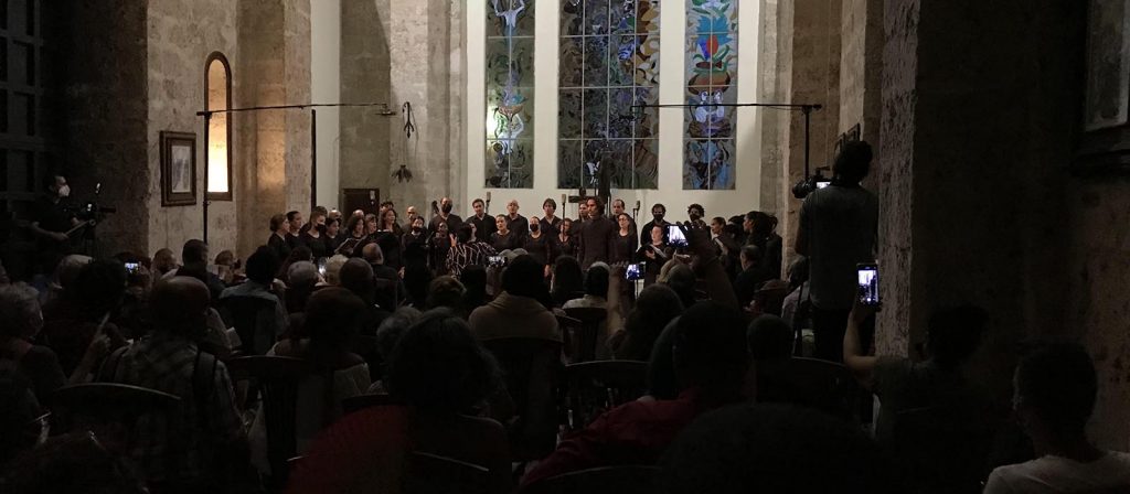 También considero oportuno mencionar el trabajo previo, el montaje y el régimen de ensayos junto al Coro Nacional, que no suele ser dirigido por invitados de otros países. Es menester recalcar que una parte de sus integrantes, específicamente el coro de cámara Entrevoces, recién regresaba a Cuba luego de una exitosa gira por Tenerife, España, y, además de prepararse para este concierto, el Coro se vio inmerso en la Gala Inaugural de Cubadisco 2022 junto al pianista cubano Nachito Herrera. El tiempo para la concreción de este proyecto fueron apenas dos semanas de intenso trabajo, aprovechados al máximo por todos los involucrados.