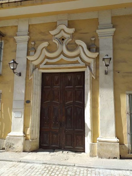 Muy notables en las fachadas de este período fueron las puertas, ventanas y rejas. Acerca del recio portón de la entrada —que bajo la portada hace visibles sus maderos, a veces encerados, a veces envejecidos por la pátina de la lluvia y el sol—, solo acotaré que para entonces predominaron los del tipo llamado “a la española”, de dimensiones más apropiadas a la escala de la portada, con un postigo u hoja de menor tamaño por el que se entraba y salía diariamente. Se mantuvo la costumbre de incorporar a sus gruesos tablones clavos de hierro o de bronce, en ocasiones embutidos en la madera, pero también rematados con rosetas molduradas meramente decorativas. Se destacó en los portones habaneros la presencia de la aldaba o llamador, pieza de un bronce de exquisita factura que puso de moda enrevesados diseños con múltiples alegorías: finas manos femeninas sujetando una manzana o naranja (motivo muy tropical).