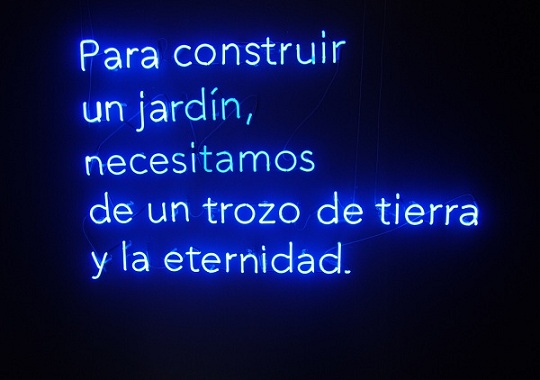A la entrada del local donde se proyecta este material, aparece una escultura de neón sobre la frase del paisajista y escritor francés Gilles Clément que reza: Para construir un jardín, necesitamos de un trozo de tierra y eternidad. “Es una frase que no solo te lleva a pensar en la tierra, sino en cómo las cosas se van construyendo”, afirmó el artista.
