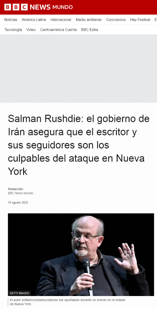 Una vez más en las noticias del atentado a Rushdie pesaban la nacionalidad y el credo del atacante, de hecho, eso era lo más dicho. Se hablaba de que la fatua contra el artista estaba vigente, si bien en una especie de moratoria. Se fabricó de tal forma una especie de fantasma eterno que criminaliza a todo el Islam. La libertad de creación contra el oscurantismo, Occidente contra Oriente, civilización versus barbarie. Todos los prejuicios posibles caben en las mentiras mediáticas, todas las matrices de opinión sacadas a partir de un lamentable suceso, de un crimen con el cual nadie está de acuerdo. Pero no existe una culpa colectiva de toda una civilización en torno a la vida azarosa de Rushdie. El fantasma inflado no abarca la totalidad del Islam.