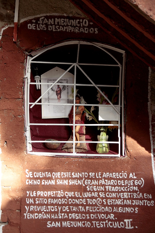 A la entrada del patio de los framboyanes, como un símbolo desacralizador, el santo patrono que ha escogido el Mejunje: San Mejuncio de los Desamparados, que tiene una imagen peculiar, mezcla de estilos y tribus urbanas y al que le ponen flores y le piden deseos que algunos aseguran son cumplidos por el susodicho. A los pies del investido santo la profecía que encierra los sentidos de este espacio: “el lugar se convertirá en un sitio famoso donde tod@s estarán juntos y revueltos y de tanta felicidad algunos tendrán hasta deseos de volar”.