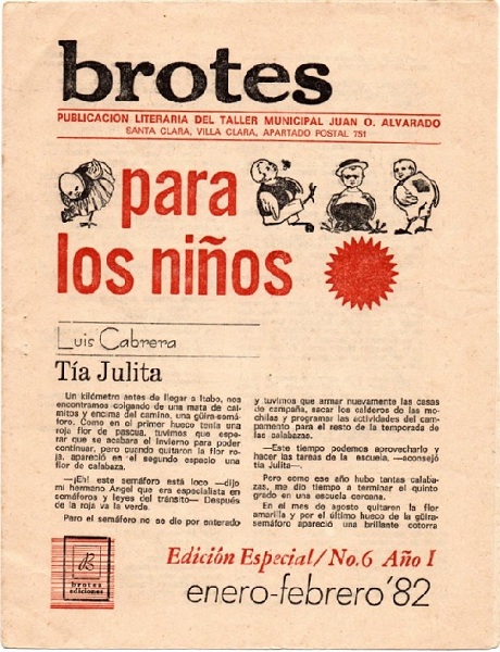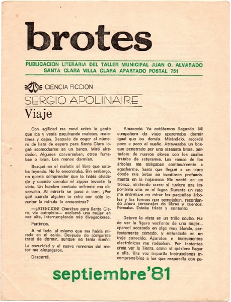 La preciosa hoja literaria Brotes, que editaba y producía en la imprenta del Partido —donde su padre era administrador y él se desempeñaba como ayudante de cajista— marca un antes y un después en los modos de hacer, entender y promover la poesía por estos lares. Si Santa Clara ocupó un lugar destacado en eso que se conoce como promoción de los 80, aquel modestísimo y exquisito plegable ofició como vocero de no pocos de sus más lúcidos representantes.