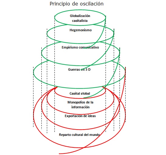 El principio de oscilación contiene a los otros tres: la precedencia queda explícita en la sucesión de círculos, la correspondencia se aprecia en la equivalencia de los círculos (ver líneas de puntos suspensivos) y la generación se nota en la combinación de los dos anteriores. Por su parte, las espirales aportan una visión cinematográfica del ciclo vital del neoimperialismo, el cual parece que late.