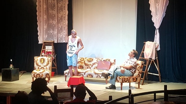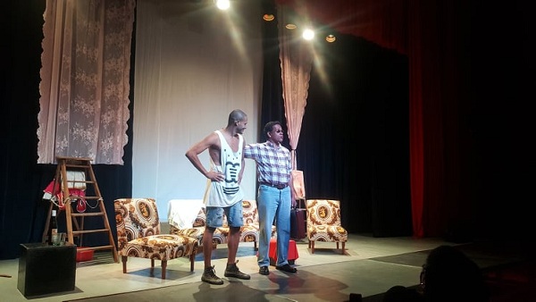 Mientras esto ocurre, adentro se disponen los elementos de la escenografía: escaleras que simulan andamios, una mesa en el centro de las butacas, cortinas, vasos, y la botella de ron con que los protagonistas Manolo y Cheo Malanga brindarán por el regreso, tema recurrente en el teatro cubano de los últimos tiempos, y que Fátima tampoco ha dejado escapar. Durante casi una hora los personajes, asumidos por Darwin Matute (bailarín con aptitudes para el teatro) y Douglas Kindelán (tramoyista devenido actor) respectivamente, relatan una historia contada en múltiples ocasiones, pero retocada por cada intérprete y director.