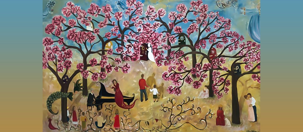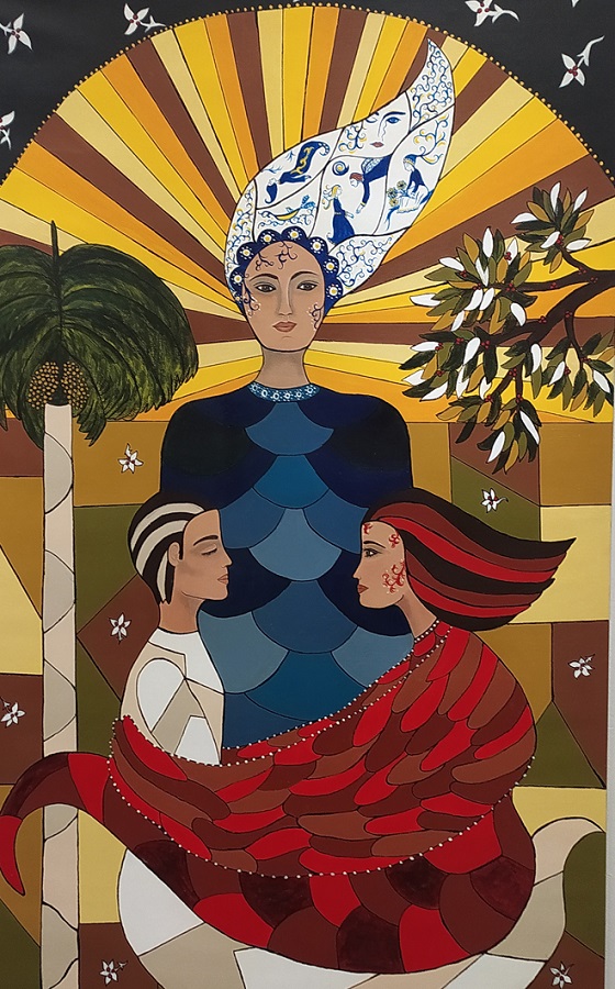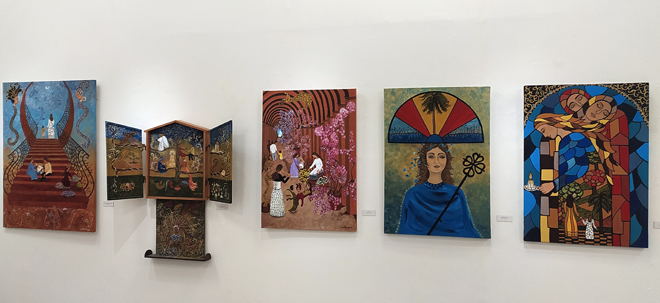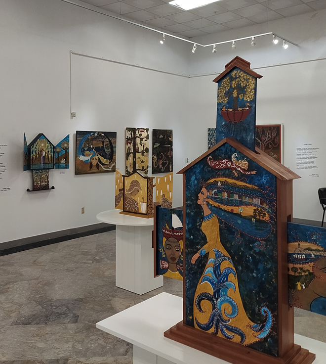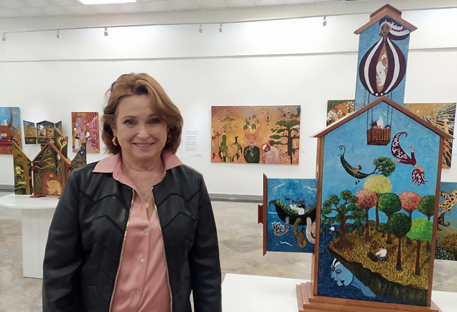 La galería, de alto puntal y amplísimas paredes, acoge 38 obras —de las cuales siete son retablos y 31 lienzos— en las que ella plasma todo un mundo onírico que se entremezcla con la naturaleza —uno de sus temas recurrentes— y, por supuesto, el hombre y la mujer en su justo centro. Pero Sueños en vilo, título de la exposición, tiene un extra, un añadido: la poesía flota de cuadro en cuadro, se mete en él, nos transporta a otros universos que nos regaló (y legó) Cintio Vitier en su penetrante y lúcida obra poética.
