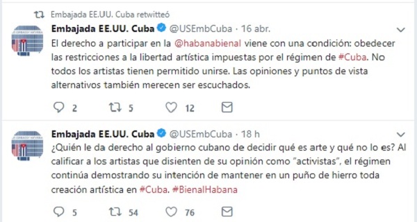 Un tweet de la Embajada estadounidense aparecido tras la publicación en La Jiribilla del artículo “La Bienal y las razones que no asisten a Tania Bruguera”, del artista visual y crítico J. Ángel Téllez Villalón, aporta evidencias que no pueden ser pasadas por alto: