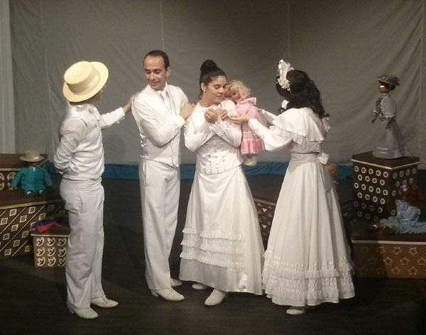 Si en La Edad de Oro la experiencia de Pilar en su visita veraniega a la playa es palabra hermoseada por la poesía con elevado aliento humanista, aquí el verbo se convierte en acción escénica y movimiento coreografiado, los versos son parlamentos que narran, describen y acompañan gestos visibles de generosidad y solidaridad humana, fragmentados en las voces de los actores y respaldados por la música. Sobre las tablas predomina el color blanco, límpido y puro en el vestuario de época de los actores, que se salpica de tonos pastel con los trajes de las muñecas, en el paisaje humano de las niñas con sus nanas en la playa. El gesto y el movimiento se han trabajado con precisión para recrear orgánicamente los modales y actitudes de la clase aristocrática del siglo XIX cubano, en contraste con la urgencia en la voz de la mujer que llora por su hija enferma, en fiel contextualización de la conocida historia martiana.