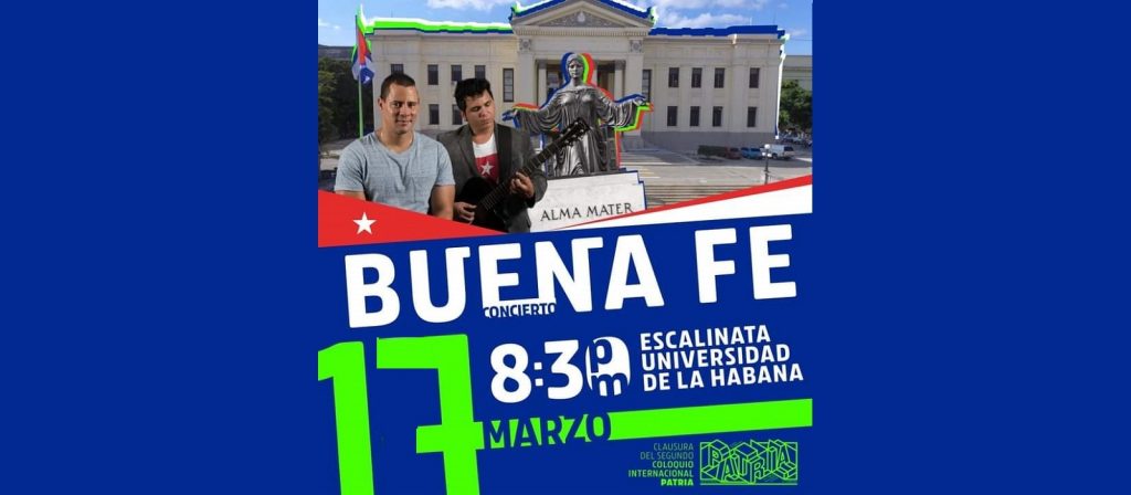 La Casa de las Américas invita este viernes 17 de marzo, a las 8.30 p.m., en la escalinata de la Universidad de La Habana, al espectáculo político-cultural de cierre del coloquio Internacional «Patria», con la participación de realizadores audiovisuales, músicos, artistas del video mapping y expertos nacionales e internacionales. No te pierdas el gran concierto del grupo Buena Fe y la puesta audiovisual a escala arquitectónica, que por primera vez se realiza en nuestro país.