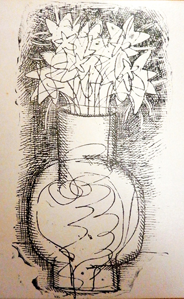 Por esa época comenzó a pintar flores. Entonces era el responsable del suplemento cultural del periódico Hoy, a la vez que desempeña otras tareas. Al estar un tanto desvinculado de la pintura por labores públicas más urgentes, comienza a “hacer mano” con lo más fácil: flores. Aunque estas flores, si se les quita su principal soporte, el búcaro, se metamorfosean en un abigarramiento de líneas, formas y colores. De ellas saldrían después otras formas más complejas que servirían de base de otros tantos dibujos que continuaría haciendo con los años. Incluso, podría afirmarse que las estrellas que incorpora a sus últimos cuadros, salen de esos primeros ejercicios.