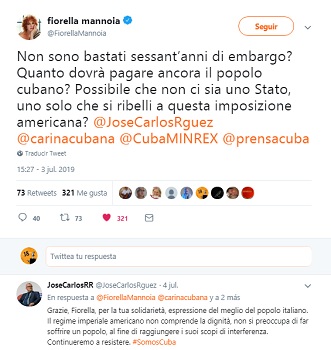 El Embajador de Cuba en Italia, José Carlos Rodríguez Ruiz, agradeció, también por su cuenta en Twitter, la solidaridad de la intérprete y compositora italiana con el pueblo cubano. “Gracias, Fiorella, por tu solidaridad, expresión de lo mejor del pueblo italiano. El régimen imperial estadounidense no comprende la dignidad, no le preocupa provocar sufrimiento a un pueblo”.