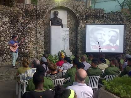 Mientras caía la tarde del tercer martes de mayo, se preparaba el patio de la fragua para un cierre de lujo a esta primera jornada de homenaje. Artistas y promotores de la comunidad, combatientes y oficiales de la PNR y el MININT, y transeúntes que decidieron detener su paso, recordaron ideas martianas como aquella en que la Patria ha de ser ara y no pedestal donde saciar nuestra vanidad, y compartieron un momento de especial salutación a Martí y Fidel, ofrecido por el trovador Silvio Alejandro Rodríguez y varios niños actores de La Colmenita.