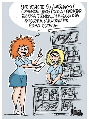 Es tan triste cuando nos atienden con esas caras largas, como si estuvieran en la sala de su casa y no prestando un servicio, que cuando el dependiente me sorprende con el “dime, mami”, una siente algo, esa complicidad otra, un cosquilleo en la panza, porque lo ha dicho con los mismos códigos de una invitación a otra cosa. ¿A qué otra cosa iba a ser?… me refiero a comprar algo, lo que sea, aunque no me haga falta, con tal de no desaprovechar la oportunidad de que un dependiente me esté tratando tan bien.