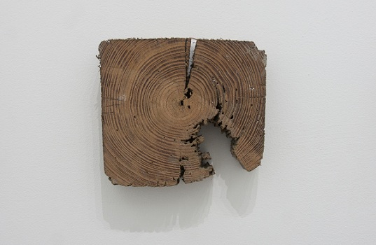 La primera presenta el tríptico Testigos, compuesto por objetos esculturados encerrados en círculos que nos remiten a la infinitud del tiempo y del espacio. El segundo nos propone Confesión, instalación compuesta por troncos erosionados de árboles cuyos anillos de crecimiento aluden al laberinto, al interminable Uróboros y a la preservación (o pérdida) de la memoria. Entre ellos, una piedra sobre la que ha sido impreso un fragmento de guión radial; esta última, peculiar “sustancia” empleada por el artista en propuestas anteriores. Las voces perdidas, disueltas por siempre en el éter, muy bien pudieron quedar encerradas en esos aros concéntricos cuya disposición también nos remite a los conocidos surcos en los discos de acetato. Estamos aquí ante una pieza melancólica y seductora, que convida al tacto y la idea; elementos que la convierten en una de las más hermosas de la muestra.