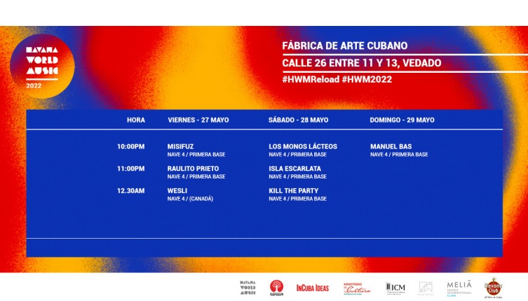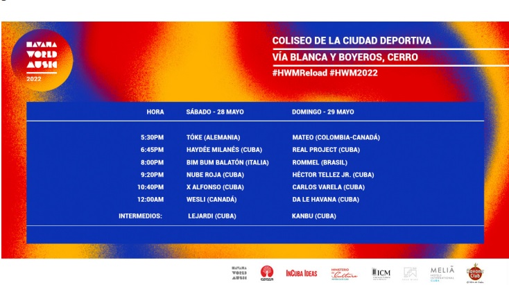 Tras varios días con anuncios de fuertes lluvias y tormentas eléctricas, el Comité Organizador del Festival Havana World Music, decidió reajustar su programación y mudar su sede al Coliseo de la Ciudad Deportiva, donde podrá asegurar dos días de música y fiesta a los asistentes. Sábado 28 y domingo 29 tendrán lugar los conciertos de esta edición en la Ciudad Deportiva, mientras las bandas ganadoras del concurso Primera Base (2020-2021) se presentarán durante el fin de semana en Fábrica de Arte Cubano (FAC).
