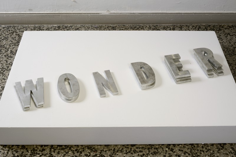 En otras la combinatoria de letras iguales le permite “jugar” a componer palabras con sentidos diferentes como hace con la palabra WONDER (DESEAR, SABER, PREGUNTARSE) donde se repetían varias letras con el propósito de reestructurarse en forma de anagrama al recolocarlas en otro orden, acción que bien pudieran hacer los propios espectadores y no solo el artista para condicionarlos a encontrar aquellas palabras posibles a ser conformadas con las mismas letras, aunque no está concebida con ese alcance.