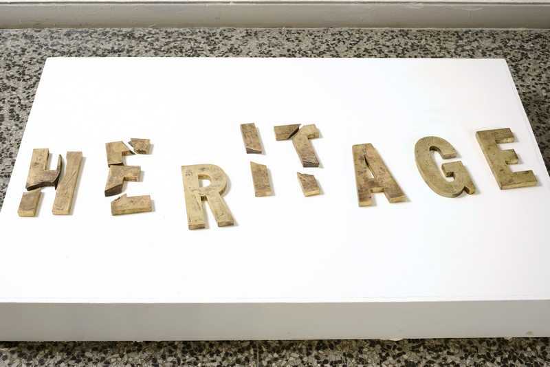 Este modo de componer estructuralmente sus obras mediante palabras y el modo de ordenarlas socava el sentido inicial de la palabra mostrada, lo recompone y resitúa en otra dirección de sentido. Así ocurre con la palabra HERITAGE (HERENCIA). Dejaba entrever en la manera de distribuir espacialmente algunas letras en la instalación, la formación visual de otra palabra, RAGE (RABIA, IRA, FURIA, VIOLENCIA) donde las otras letras en parte fracturadas indicaban lo contrario a la preservación del legado en contrapuesta alusión a ese abandono.