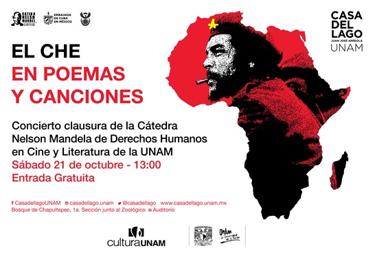 Se destacan las acciones del 21 del mes referido, cuando sumaron fuerzas la Cátedra Nelson Mandela de la UNAM de Derechos Humanos en Cine y Literatura a las del equipo de la embajada de Cuba en México, y poetas y trovadores de ambos países, en la Casa del Lago Juan José Arreola de esa universidad, ofrecieron un concierto de poemas y canciones en honor al mítico guerrillero. Entre ellos, Waldo Leyva, escritor, poeta y periodista cubano, actualmente consejero cultural de la embajada cubana en México, quien hizo una selección de textos dedicados al Che de varios escritores y poetas: La batalla del idealista, de Ernesto Sábado, Yo tuve un hermano, de Julio Cortázar, Líneas por el Che Guevara, de Carlos Pellicer, Al Che, de Manuel Cuatle, Conversaciones, de Juan Gelman, Canción antigua al Che Guevara, de Mirtha Aguirre, Che Comandante, de Nicolás Guillén y Cantata por el Che Guevara, de Efraín Huerta. Los trovadores fueron los cubanos Alejandro García (Virulo), Manuel Argudín, Lorenzo Cisneros y Manuel Mulet, y de México, el Dúo Arón Villa.