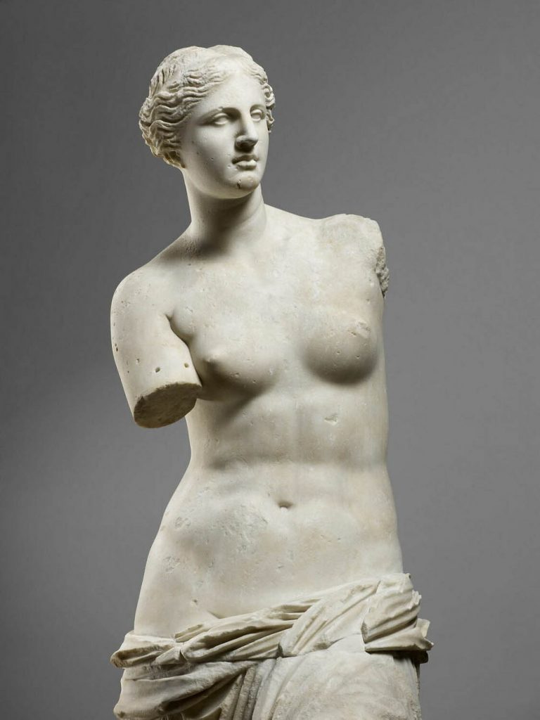 La helenística Venus de Milo —130-100 a.n.e.— tiene una gran leyenda asociada al lugar donde se encontró, su venta y posterior trasiego; según los especialistas, la escultura parte de un desequilibrio que la afecta, pues la pierna izquierda señala un peso del cuerpo que da una mayor sensación de profundidad; además, la ruptura de la frontalidad enfatiza la silueta a la izquierda; se ha escrito mucho sobre la pérdida de los brazos. La belleza se diversificó por Europa con una civilización impuesta por las armas, que desconoció la belleza de los otros, aunque asimiló mucho de otros pueblos conquistados, a los que llamó “bárbaros”.