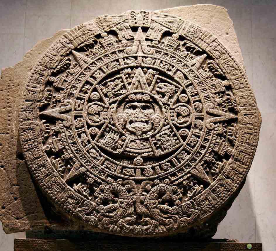 De los aztecas se conserva Piedra del Sol, un disco de basalto olivino, de unas 25 t de peso y 3,58 m de diámetro, en cuya superficie está tallado el compendio de sus conocimientos astronómicos y cosmogónicos; los motivos allí esculpidos se relacionan con los conceptos sobre numeración, astronomía, cronología y cosmogonía de una civilización que llegó a ser imperio —el sistema de numeración de estos pueblos tenía como base el 20 y no el 10, y algunas de sus mediciones para el espacio estelar han sido mucho más exactas que las realizadas con el sistema decimal—. El Códice borbónico azteca muestra a los dioses Tezcatlipoca y Quetzalcóatl, este último en forma de serpiente emplumada. En la maqueta del Templo Mayor o teocali de Tenochtitlán puede observarse un doble templo, dedicado a Huitzilopochtli, dios de la guerra y del sol, y a Tláloc, dios de la lluvia. El frente estaba prácticamente ocupado por una majestuosa escalinata doble flanqueada por gruesas alfardas de los adoratorios de ambas deidades, donde se encontraba la Piedra de los Sacrificios junto a un Chac Mool. Este espléndido templo fue objeto de siete reedificaciones y once ampliaciones, y quedó concluido antes de que los conquistadores lo arrasaran en 1521. Ahora solo hay ruinas.