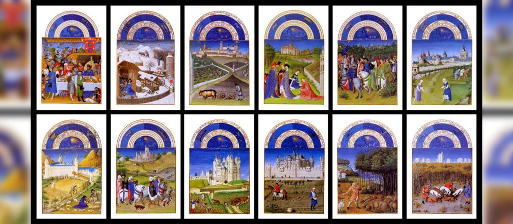 Posiblemente no exista libro tan completo en la recreación de la vida cotidiana piadosa de los nobles medievales, como Las muy ricas Horas del duque de Berry —hacia 1410—, realizado en el taller de los miniaturistas Herman, Paul y Johan Limbourg, aunque se dice que intervinieron más de 25 artistas que enriquecieron las páginas, sucesivamente, con diferentes imágenes: gorros, túnicas orladas, torres góticas, escenas campestres, opulentas cenas… El volumen, profusamente ilustrado con 131 miniaturas, recoge plegarias para ser recitadas en las horas canónicas.