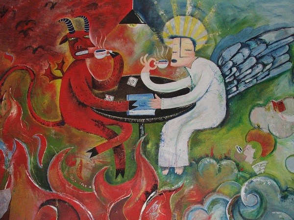 Cuando Camaleón le piensa y le elabora un mural, ocurre la asimilación de la esencia de un sitio. El Café literario de G, con la ilustración que en esos años decoró una de sus paredes, pierde parte de sus cualidades en tanto espacio homogéneo donde el transeúnte, con sus diversos ritos, consume café en una mesa apartada donde no hay interrelación con desconocidos. Esa no resulta la peculiaridad de ese espacio, sino lo contrario: un lugar donde el diálogo, el debate sin importar credos queda a disposición del pretexto de tomar café. El café une al ángel y al diablo (el bien y el mal) en un mismo estado primario de necesidad de comunicación, en un mismo espacio idílico cuyos límites solo se perciben como confort.